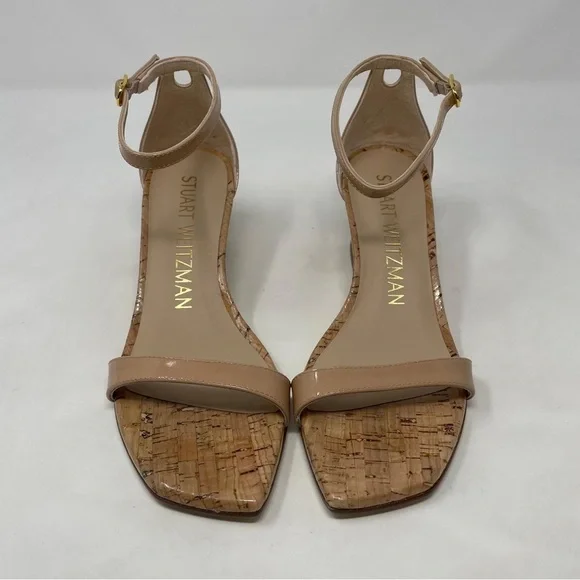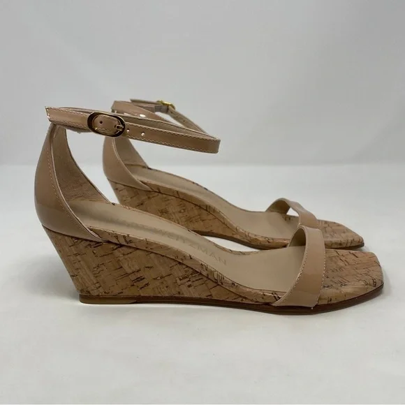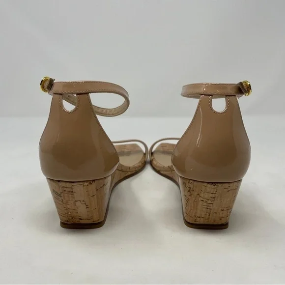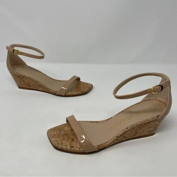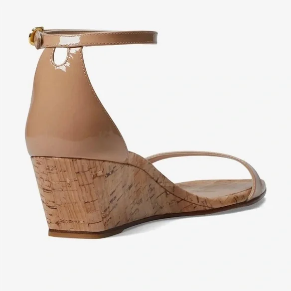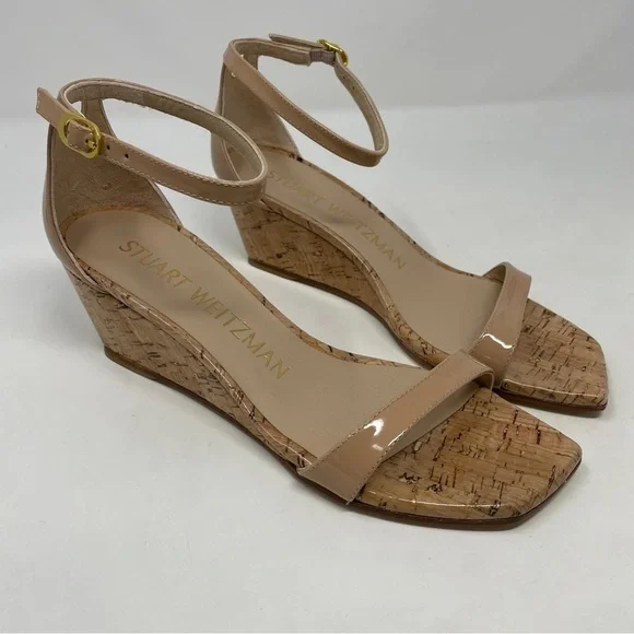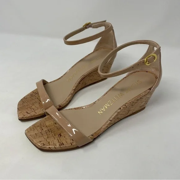 Stuart Weitzman Nudistcurve 50 Wedge Cork Patent Leather Ankle Strap Sandals NWT