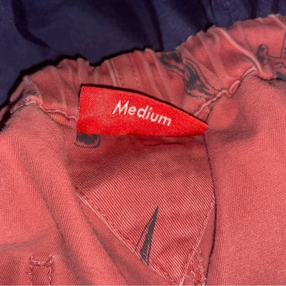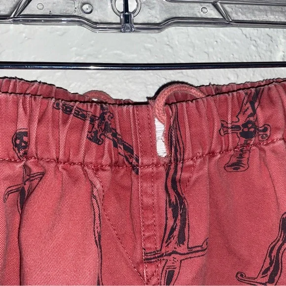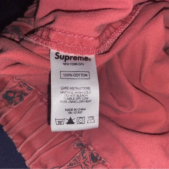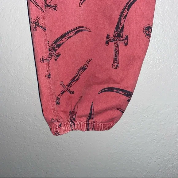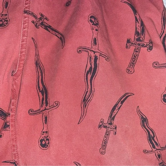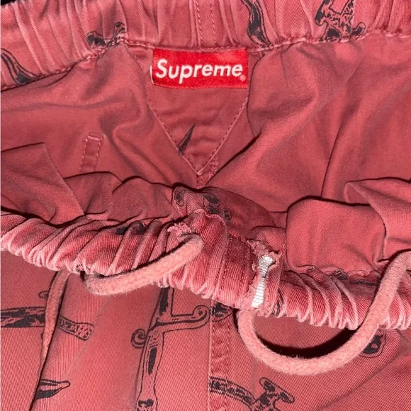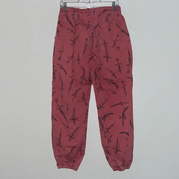 Bold red Supreme pants. Features intricate black sword design. Eye-catching style.