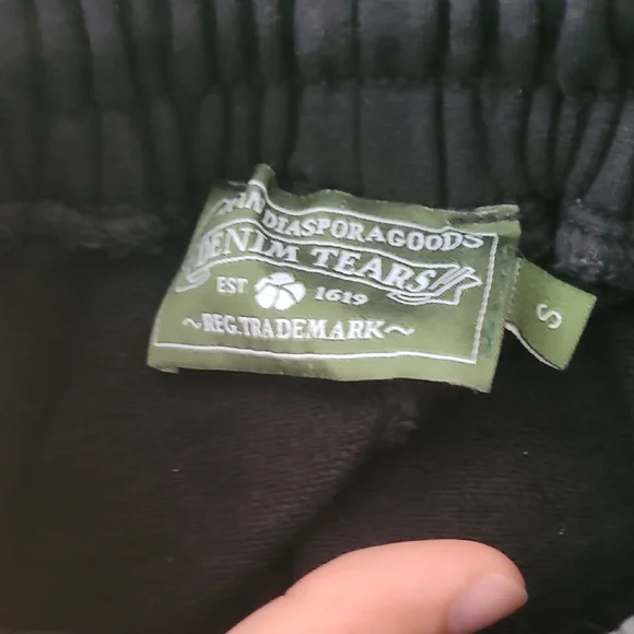 Stylish black joggers featuring a white floral print. Comfortable and trendy.