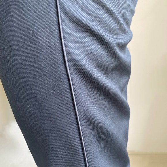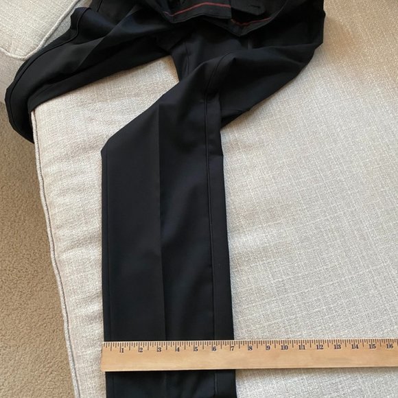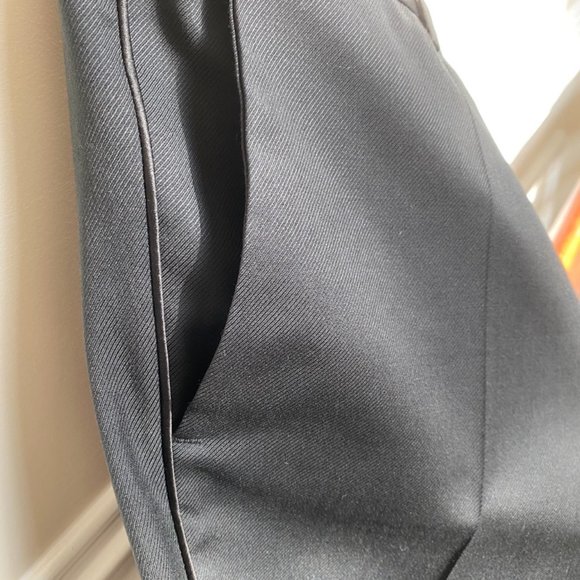 Size 32R US IT 48Worn once for a graduation ceremony with Versace Collection jacket SOLD SEPARATELYIn like brandnew condition (even pockets in back are yet sewn closed! - did you know they do that to protect the garment from losing its shape?)This suit pants feature a satin silk stripe down the outseam and belt loopsInseam approx 30" (see new pictures added)Pitch black!virgin wool with silk trims