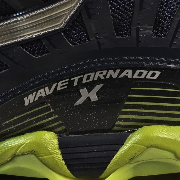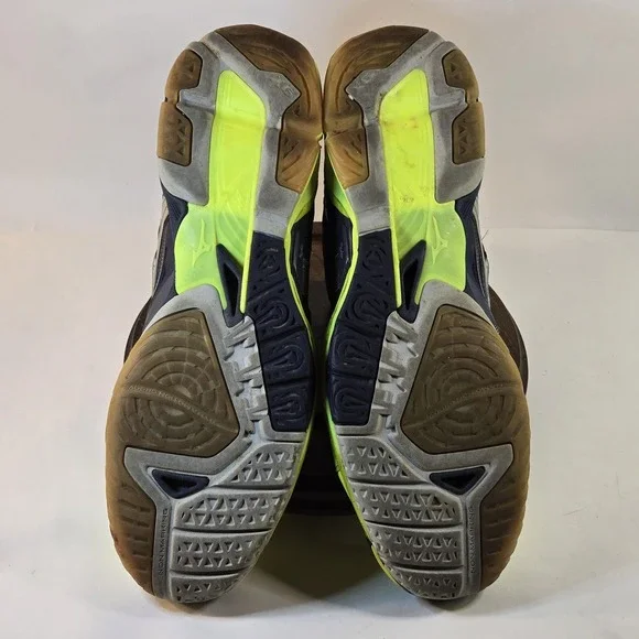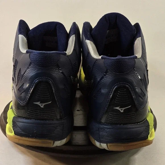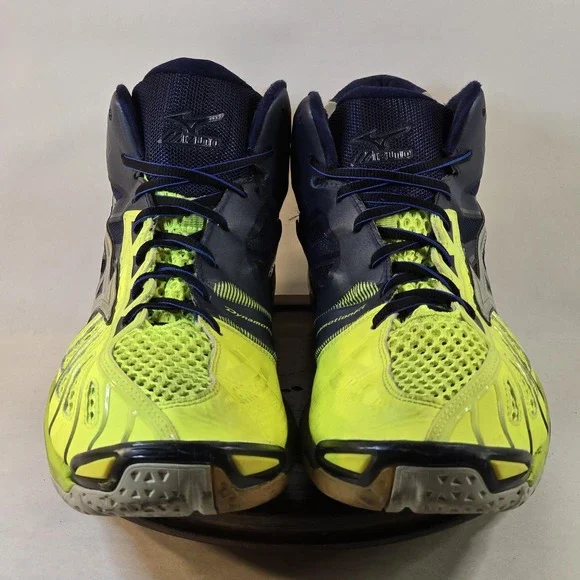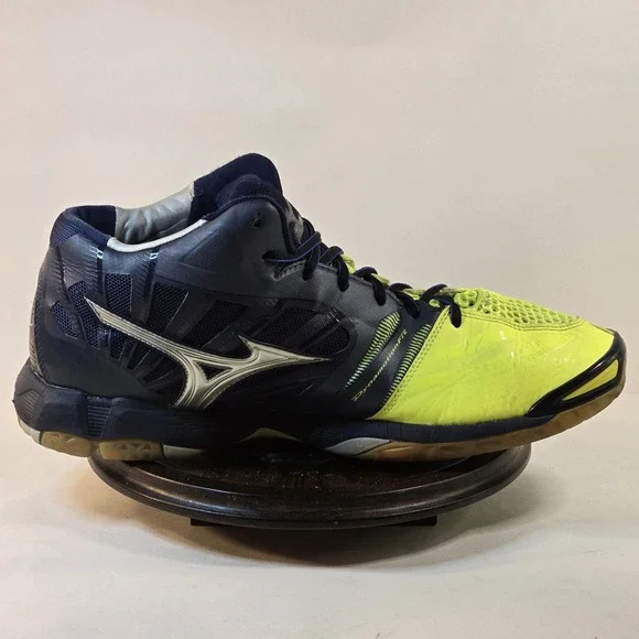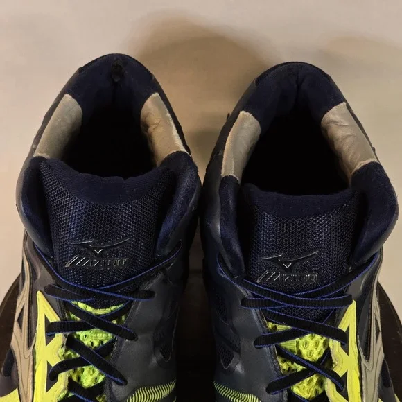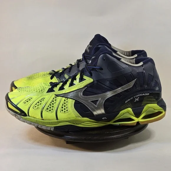 Mizuno Wave Tornado X Volleyball Shoes Mens Size 15 Navy Yellow DynamotionFitCondition: Fair - Moderate wear with visible signs of use throughout. The right shoe has heavy wear at the inner heel collar, with fraying and a hole in the lining fabric (see close-up photo). Outsoles show wear and moderate discoloration but are intact. Some scuffs and creases on the uppers.Model: Wave Tornado XColor: Navy blue and neon yellow with silver Mizuno logo accentsUpgraded DynamotionFit construction for locked-in midfoot supportNon-marking gum rubber outsoles suitable for indoor court sportsHigh-top design for enhanced ankle stability and supportSize: US 15 / UK 14 / Euro 50 / Brazil 47 / JP 33Made in VietnamStyle code: V1GB161747Mizuno branding at tongues, sides, heels, and soleSpecially designed for volleyball and high-impact indoor sports
