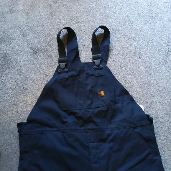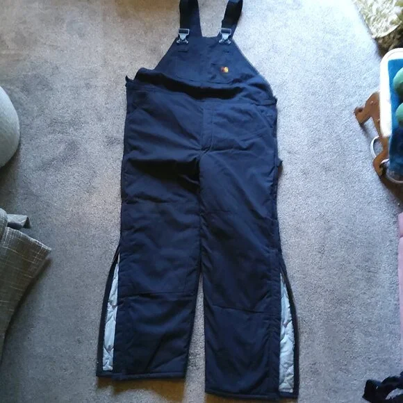 Carhartt fully lined quilted navy blue New without tags bibs. Adjustable straps with front elastic and clips to close.Size 42X32 full chest front pocket with velcro. Button close crotch. 2 front slash pockets.Bottom side zipper legs. 2 back pockets1 with hammer loop. 2 right side tool pockets.