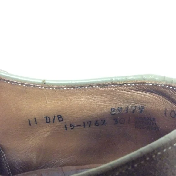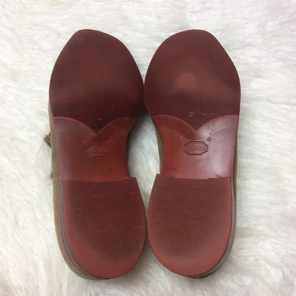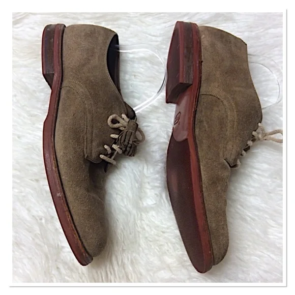 Tan suede oxfords with minimal wear to the suede other than some darker areas from wear which could be cleaned with a good suede cleaner and one fringed tassel is missing on the...