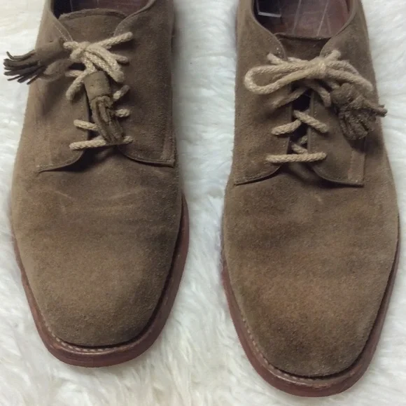 Tan suede oxfords with minimal wear to the suede other than some darker areas from wear which could be cleaned with a good suede cleaner and one fringed tassel is missing on the left shoestring.