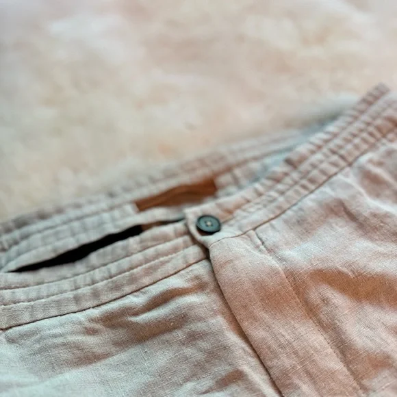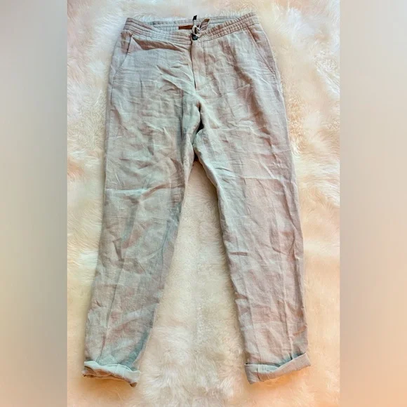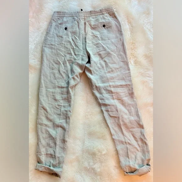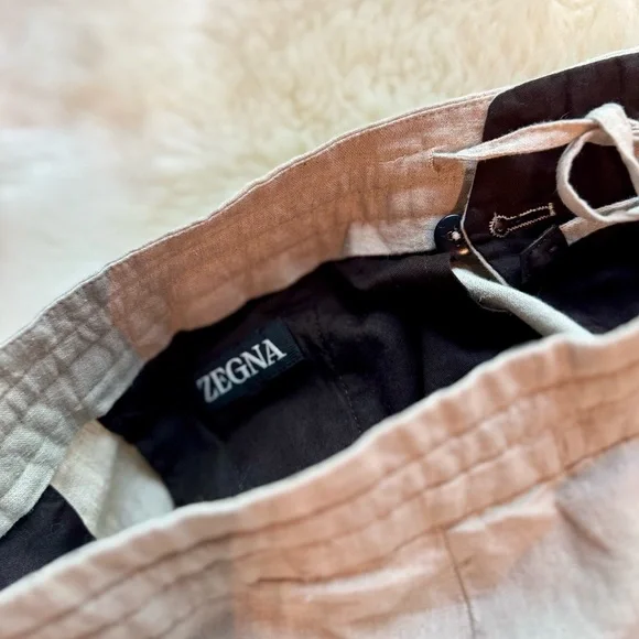 Zegna is an Italian luxury fashion house known for high-quality menswear, including linen pants. These pants are casual style, suitable for warm weather due to the lightweight nature of linen. Zegna often uses traceable, European-grown flax for their linen garments. Linen is valued for its breathability and comfort. The pants have a drawstring waistband and cuffed hems, which are common features in casual linen trousers.