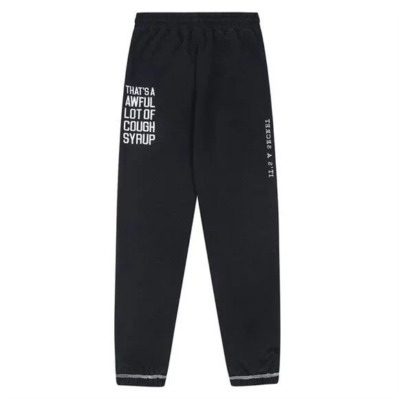 Trapstar Black Cuffed Sweatpants With Lettering PrintSize: XLColor: BlackBlack cuffed sweatpantsAdjustable drawstring waistSide pocketsWhite "TRAPSTAR" printed on one leg"THAT´S A AWFUL LOT OF COUGH SYRUP" and "IT´S A SECRET" printed on the other sideGrey lines on the hem