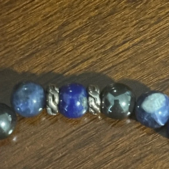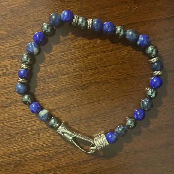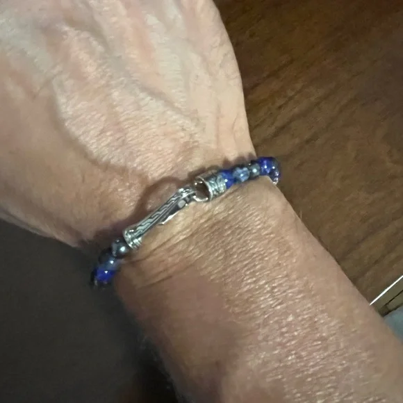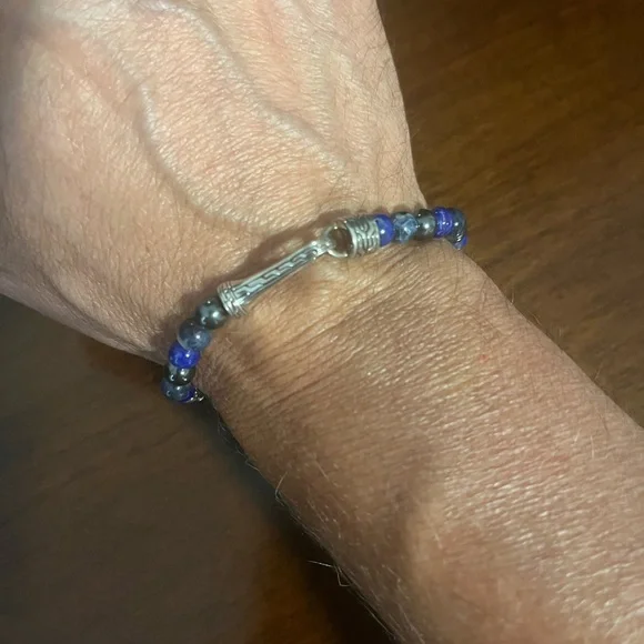 This John Hardy luxury men’s jewelry beaded and 925 sterling silver bracelet is just the right accent to your wardrobe. The sterling silver accents are slightly tarnished..natural for silver. The bracelet has a slight “kink”which doesn’t really affect the look or wear..see the photos and video.Bracelet is a size medium..8” end to end. Sorry, doesn’t come with box..just for display. Great bracelet at a great price..won’t last!!