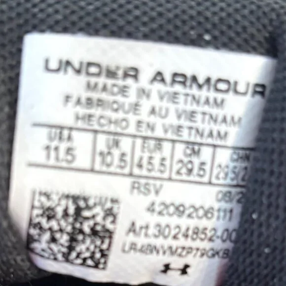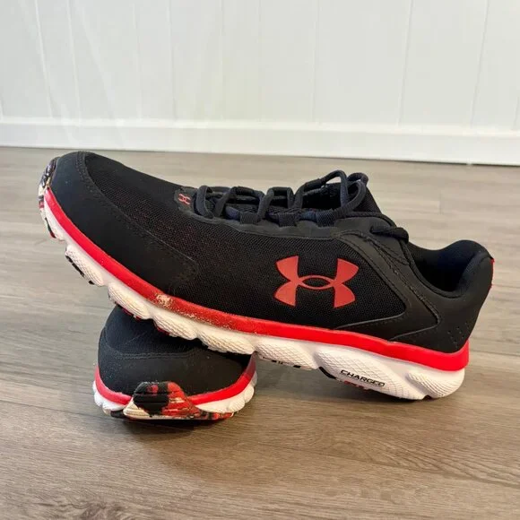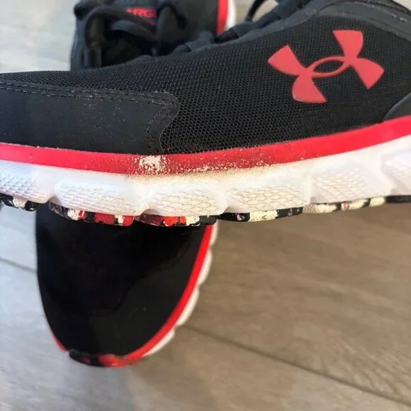 Under Armour Men´s Size 11.5 Charged Assert 9 running shoes / athletic shoes / tennis shoes.Black with red logo and details.Black laces and a marble bottom.Model: 3024852ASIN: ‎ B0D919QY1Y•Lightweight and breathable•Bold colors•Leather overlays•Cushioned compression foam midsole for comfort •For runners who need a balance of flexibility & cushioning•Solid rubber outsole•Mesh upper keeps your feet cool for miles•Unique marbled outsolePlease note:Wear to the outer left shoe in the red border is shown in a photo.Style Tags: Runner running cross trainer sneakers tennis shoes athletic athlete casual shoe athleisure streetwear fitness gym sportswear