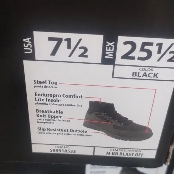 Brahma Blast Off Steel Toe Work Slip-on Lace Mesh Sneaker Shoes Slip Resistant 7½ Men´s EnduroPRO Work • new in box• never used • no damage• Enduropro anti fatigue•Breathable knit Upper • style: Blast Off • color: black grey • size:7½Men´sWomen´s 9• Comfort lightweight • WORK SHOE• STEEL TOE for protection• slip resistantThe Brahma Men´s Blast OffSteel ToeWork Shoes feature abreathable knit upper , steel toe, andslip-resistant outsolefor safety on the work site. TheEnduropro Comfort Lite Insoleprovides a comfortable and sustainable fit. The shoes are designed for those who do tough jobs, prioritizing comfort and performance. With asleek design , they are reliable and perform well day in and day out • smoke and pet free home• please be aware that I take my own photos and some colors may differ depending on camera lights or filters used. Retail $54+• thank you so muchGOD bless you and your family