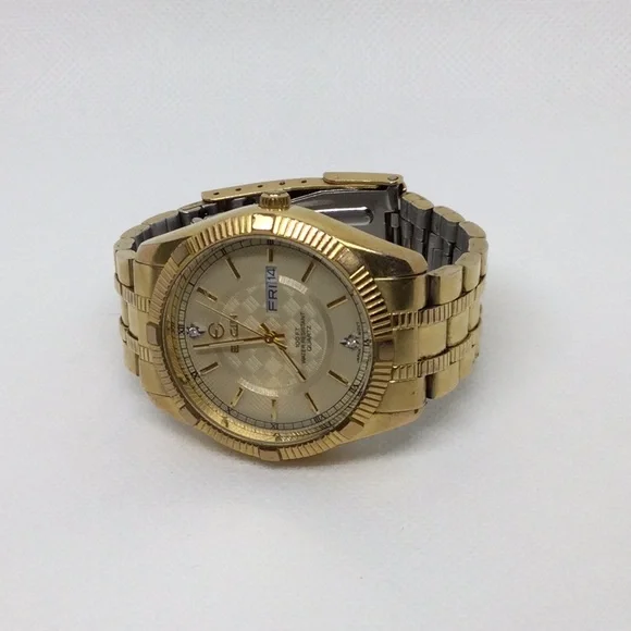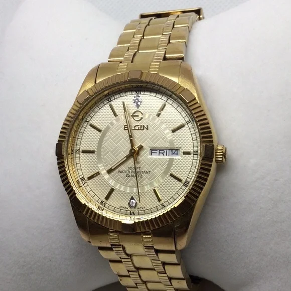 Gold-Plated Elgin Vintage WatchCondition: Used but in very nice condition•Features:•Day of the week and date display•Quartz movement•Water-resistant up to 100 feet•Two small diamonds on the inside•Fit: Suitable for a very small wristThis elegant timepiece is perfect for those who appreciate vintage watches with unique features. The small diamonds add a touch of sophistication.Make me an offer!