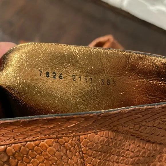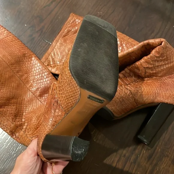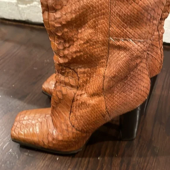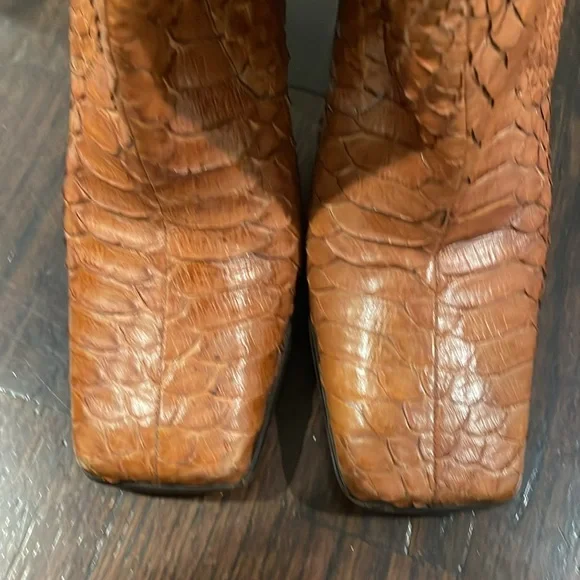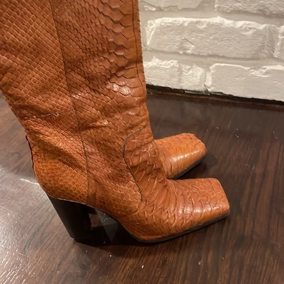 Awesome early 200’s Dolce & Gabbana Runway Boots. Snakeskin/ Python. In ver gently used condition. A few stains on one toe as shown in photo. Not really noti when wearing. These were barely work. Super fun! Great deal on designer snakeskin boots! Size 38.5 but fit close toe to 7.5-smaller 8. Calves need to be fairly slim to wear these. Thanks!