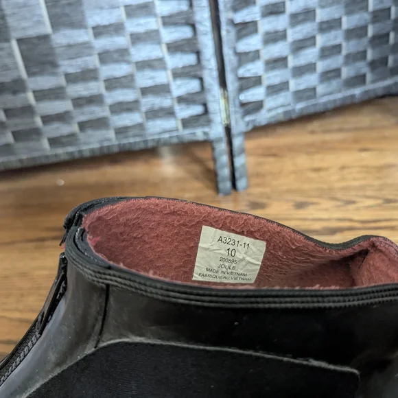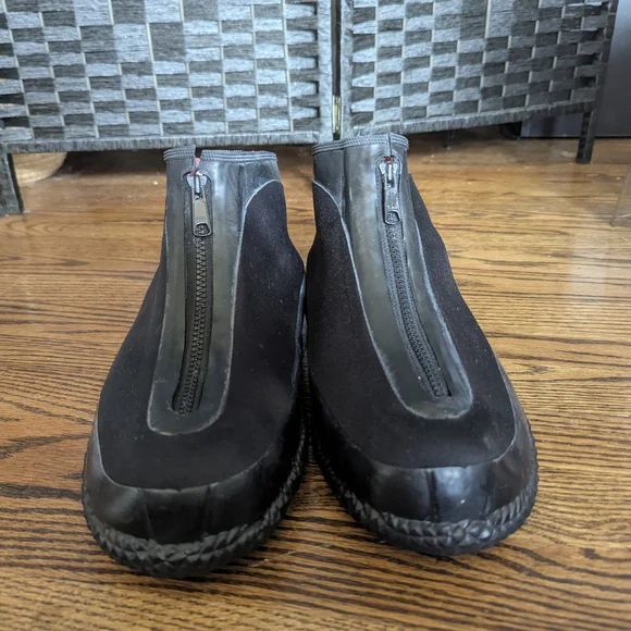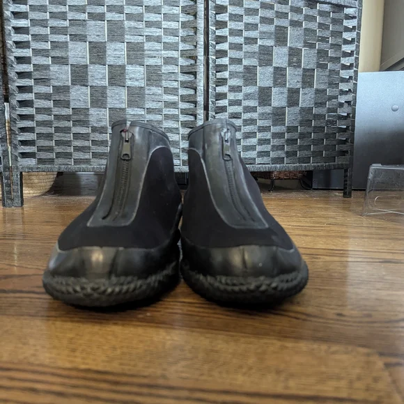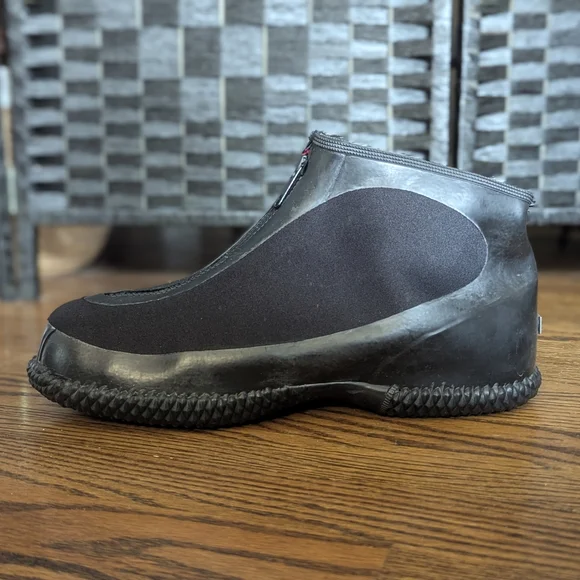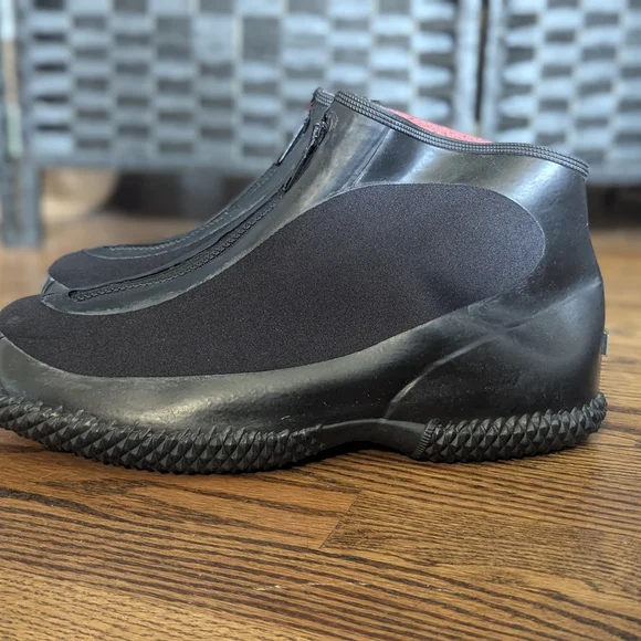 These sleek black rain and snow boots are designed for easy wear with their elastic side panels. The smooth upper material and rubber soles provide both style and functionality, making them perfect for wet weather conditions.size 10, excellent used condition