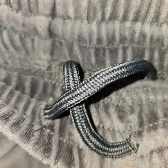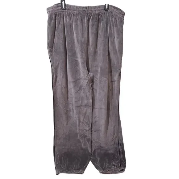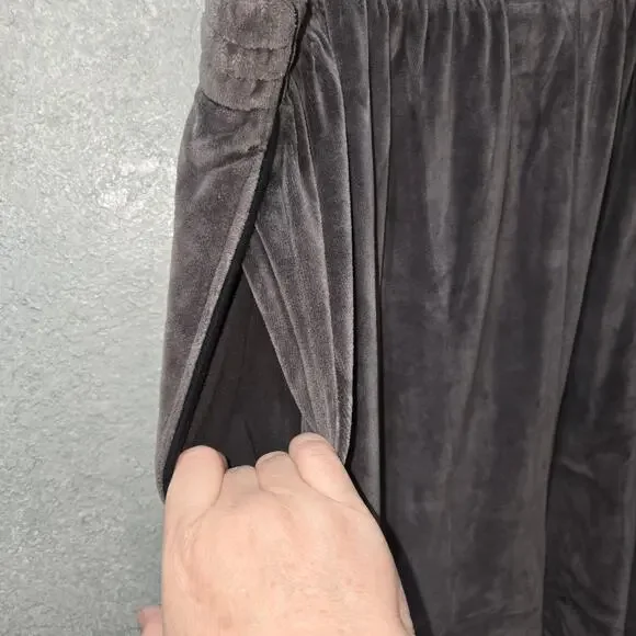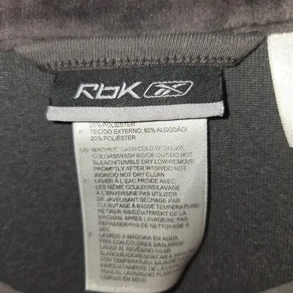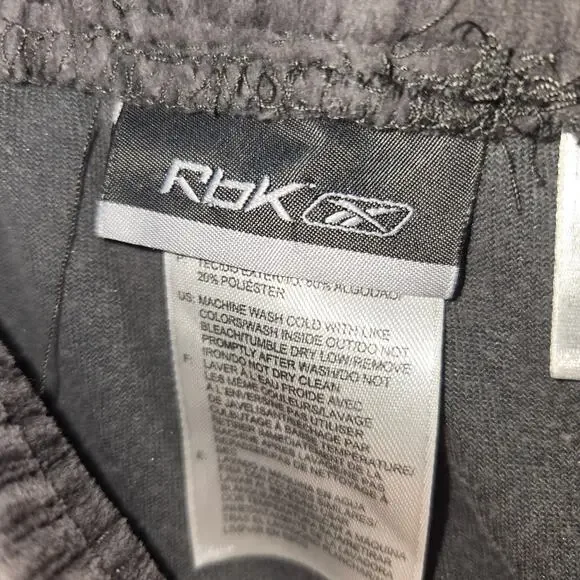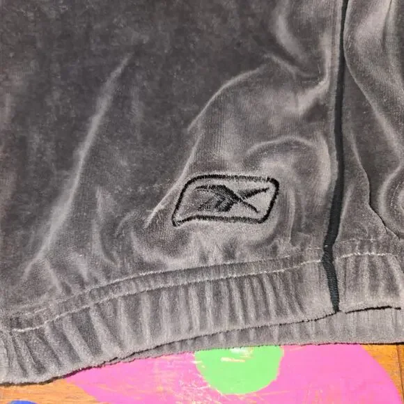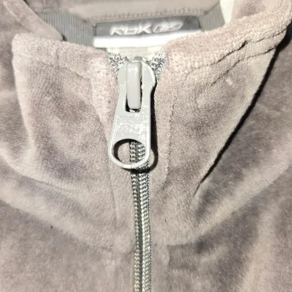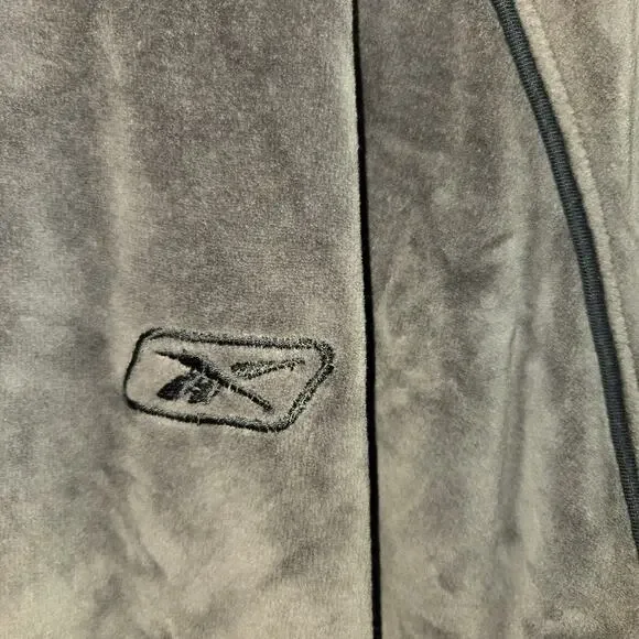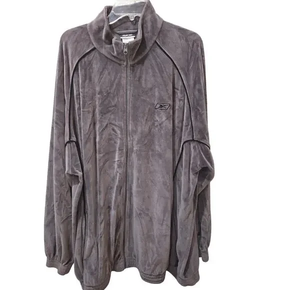 Picturing the 2 pc men´s tracksuit from Reebok (RBK) in gray velour. Features a full zip jacket with matching stretch elastic waist & hem pants with drawstring. Men´s size XLT. No noted flaws.