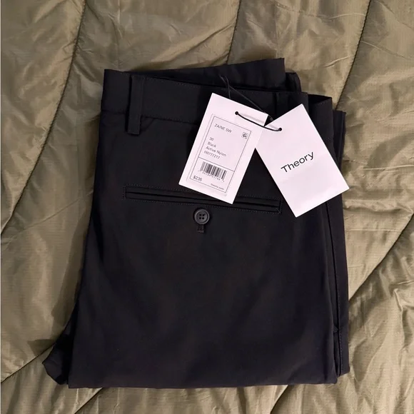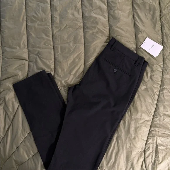 Made in USA. Experience timeless elegance with Theory´s black dress pants, featuring a classic straight-leg cut and a smooth, solid-colored fabric for a polished look. These pants are designed for versatility, making them an ideal choice for formal occasions or professional settings. Enjoy a comfortable fit that complements any wardrobe.