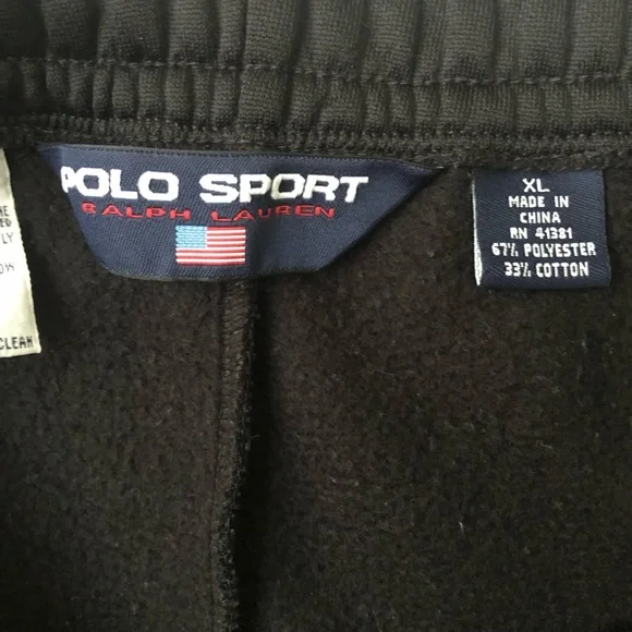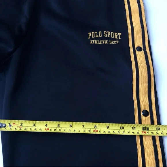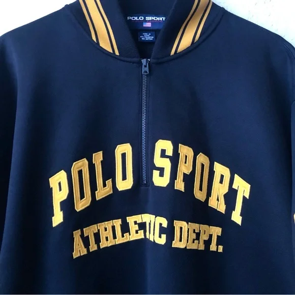 Classic Vintage Throwback to the 1990’s Era. This 1996 Ralph Lauren Polo Sport Ahtletic Dept. Men’s Varsity Basketball Warmup featuring Breakaway Pants and a 3/4 Zip-up pullover top in Black with eye catching Yellow Gold Lettering is a standout. Previously worn, but in like new condition. No signs of any issues.• 67% Polyester • 33% Cotton • Size XL