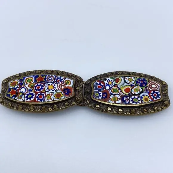 Antique Victorian Millefiori Glass Brass belt buckleSigned: unbrandedJewelry Type: belt buckleMetal Color: brassElements: millefiori glassSize: 3.25 inch long x 1 inch wide