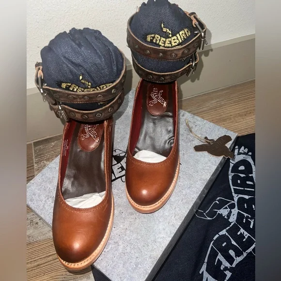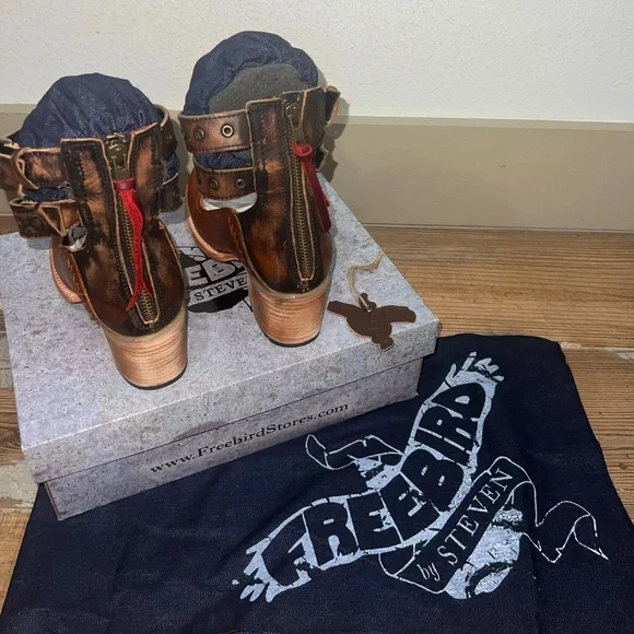 Brand New Freebird Candella Cognac size 9.0 US by Steven.Comes with everything you see in the pictures including box, dust scarf, charm, and Freebird form cushions to hold the structure. Simple, but always on trend, Freebird Randi features an open construction design and a mid stacked heel. Leather ankle straps and a round toe create a clean feminine silhouette, truly a must-have for your shoe collection.FEATURES*Distressed leather uppers*Leather lining*Leather sole*Stacked heel is approximately 3"*Cushioned footbed*Adjustable ankle straps*Back zipper closure