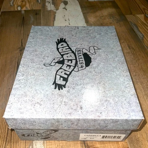 Brand New Freebird Candella Cognac size 9.0 US by Steven.Comes with everything you see in the pictures including box, dust scarf, charm, and Freebird form cushions to hold the...