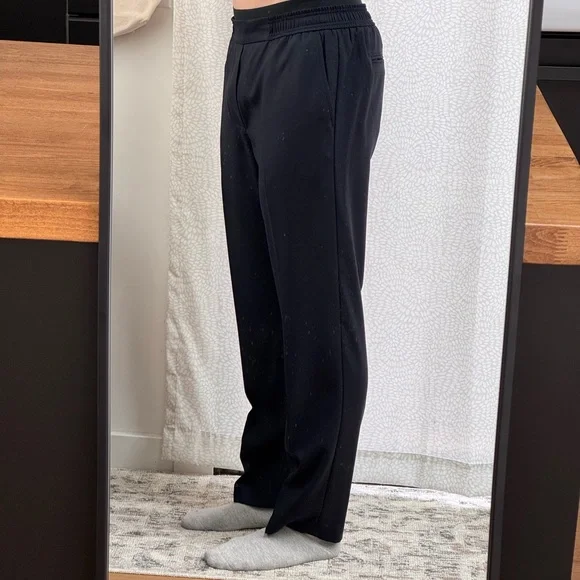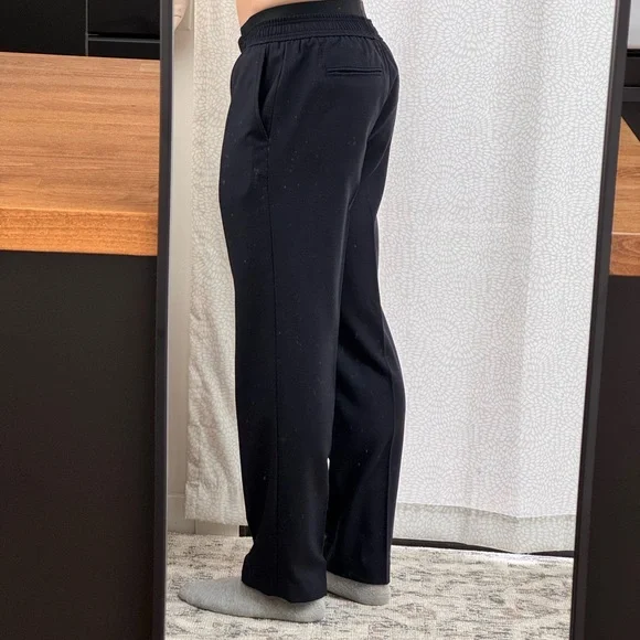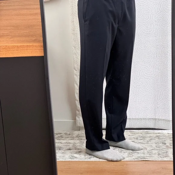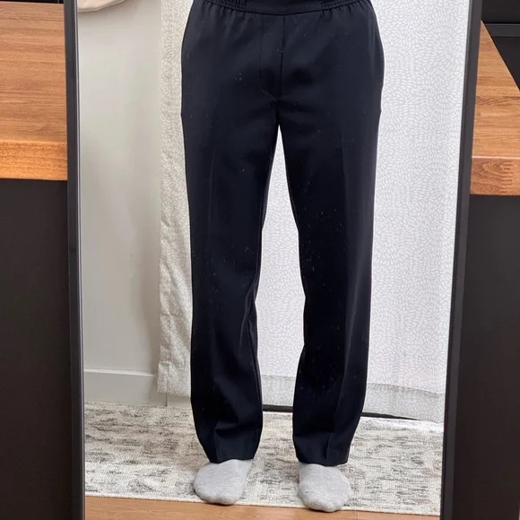 Sleek navy dress pants. Elastic waistband. Comfortable fit.Navy suit trouser. Elasticated waistband with interior drawstrings. Two slash pockets at front. Two double welt pockets...