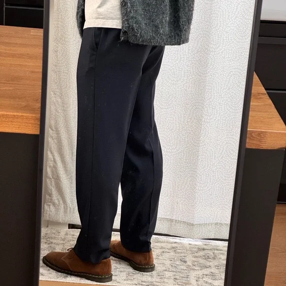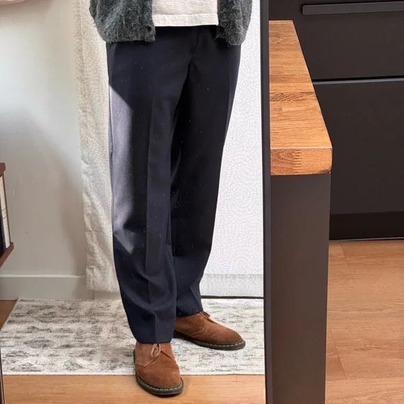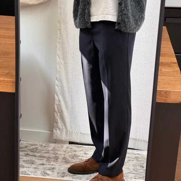 Sleek navy dress pants. Elastic waistband. Comfortable fit.Navy suit trouser. Elasticated waistband with interior drawstrings. Two slash pockets at front. Two double welt pockets at back. Blind hem. 100% Wool.