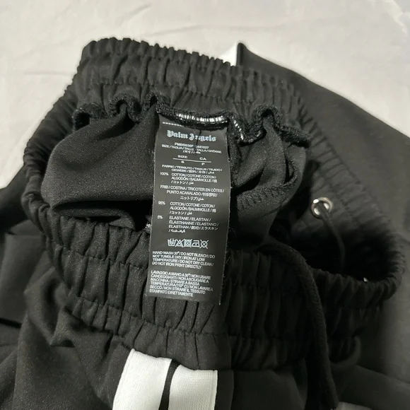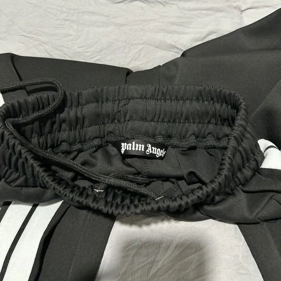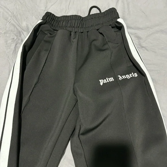 Elevate your style with Palm Angels black track pants. Featuring a sleek design with white stripes, these pants offer both comfort and fashion. Perfect for any casual outing.