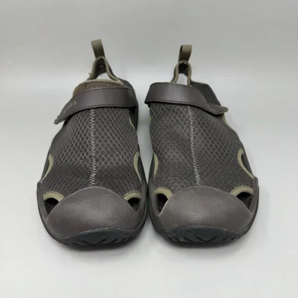 Elevate your summer style with these brown Crocs Swiftwater mesh wave sandals. Designed for men with a US shoe size of 13, these slip-on shoes feature a solid pattern and a logo...