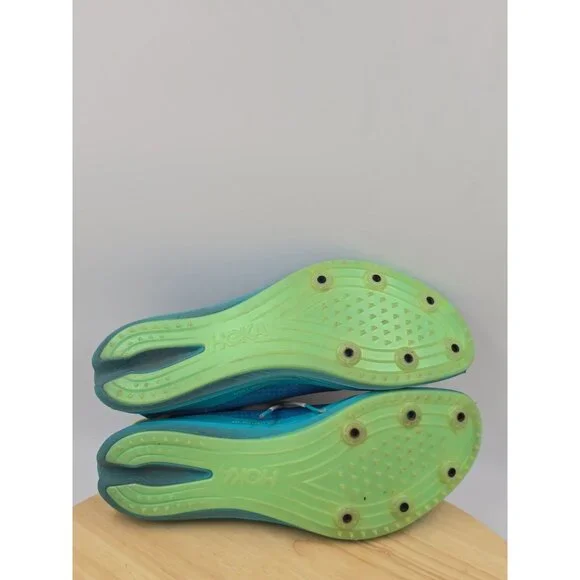Hoka One One Crescendo MD Track Spikes Mens Size 9 Womens Size 10.5 Diva Blue. IN good pre-owned condition. Flaws- some wear on edges of front an back soles- missing spikes- some staining on toe-beds see pictures above.