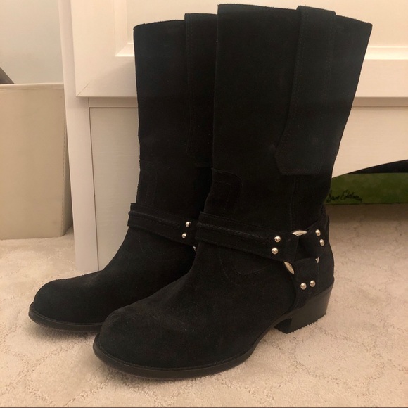 Giuseppe Zannoti Black Suede Moto Boot, Size 8(39) Excellent condition except missing one stud at harness (see pic) but not noticeable at all when wearing. Otherwise look just like new. Some slight wear on doles. Only worn a few times. Sized as 39 but fit like a true 8.Suede upper10" shaft heightPull-on style13" calf circumferenceRound toeFully lined in leather1" block heelLeather soleMade in Italy