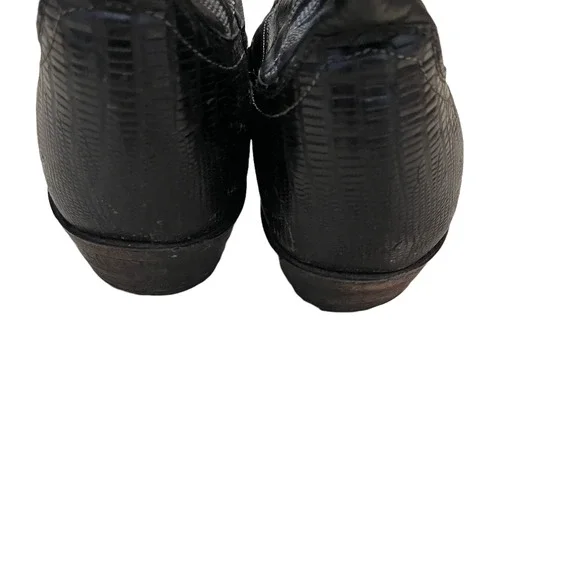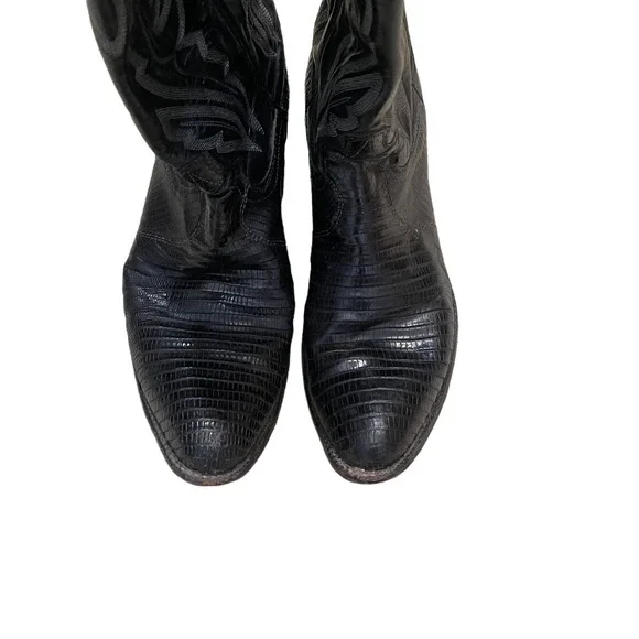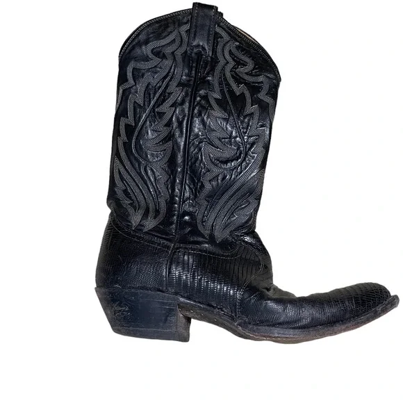 Uppers show some wear from use such as; dirt, scuffs, marks, rubs, etc.Soles show wear but still have life left.Please see pictures.Brand- JustinMaterial- Lizard LeatherSize- 9DColor- BlackStyle 8313Measurements:Heel- 1.75"Heel to toe- 11.75"Width- 3.75"Measurements taken from the outsole.