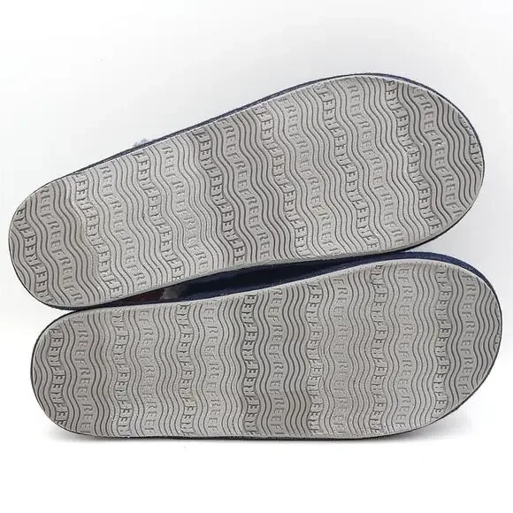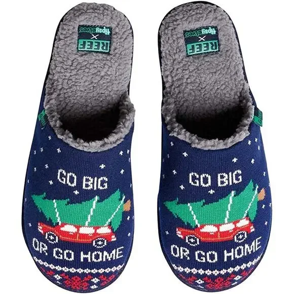 Reef x Tipsy Elves Men Christmas Mule Slippers Size US 9 Navy Go Big or Go HomeShoe store demo pair. Very light marks on the soles from being handled and/or tried on in a store...