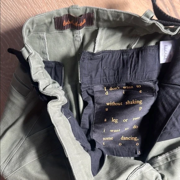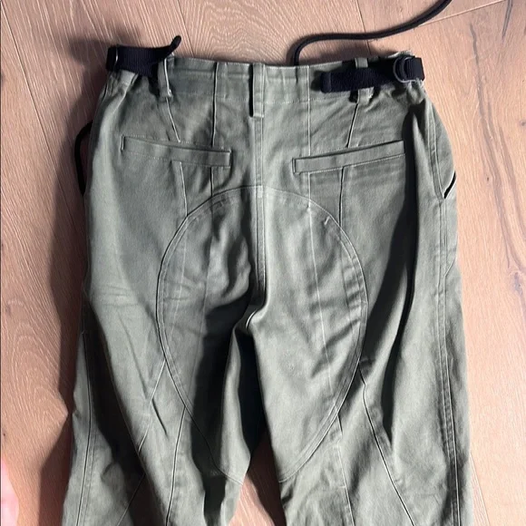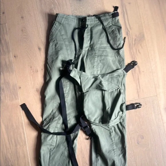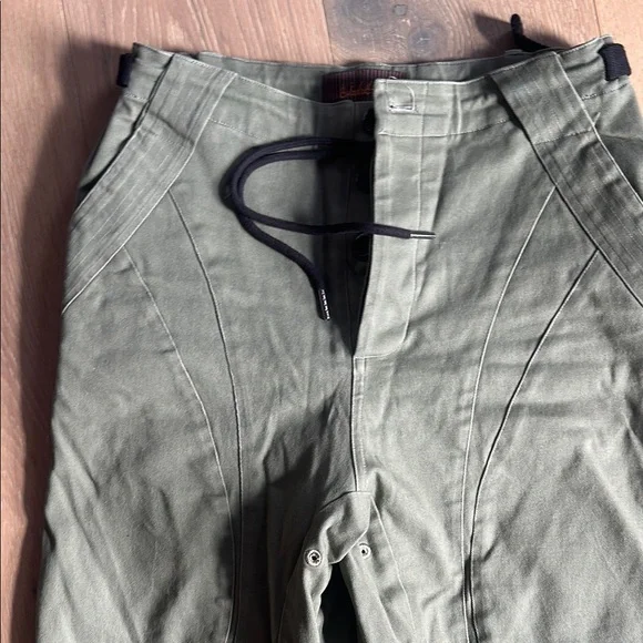 Olive green pants. HC size 1, fits like a 28. With detachable leg pocket.