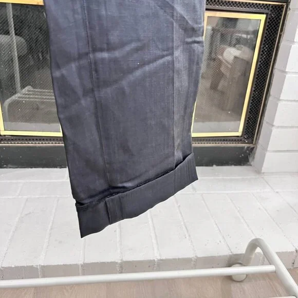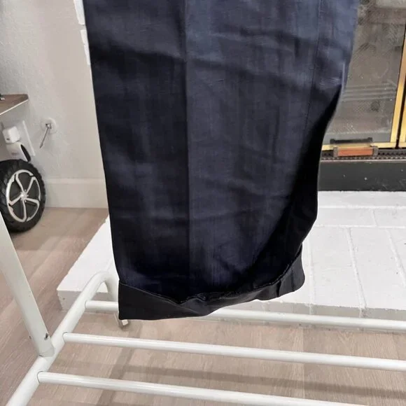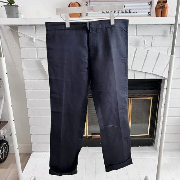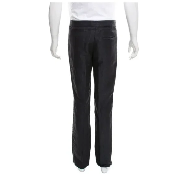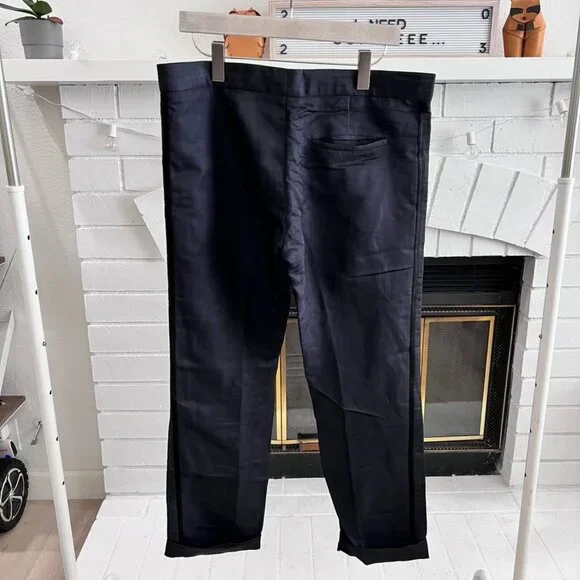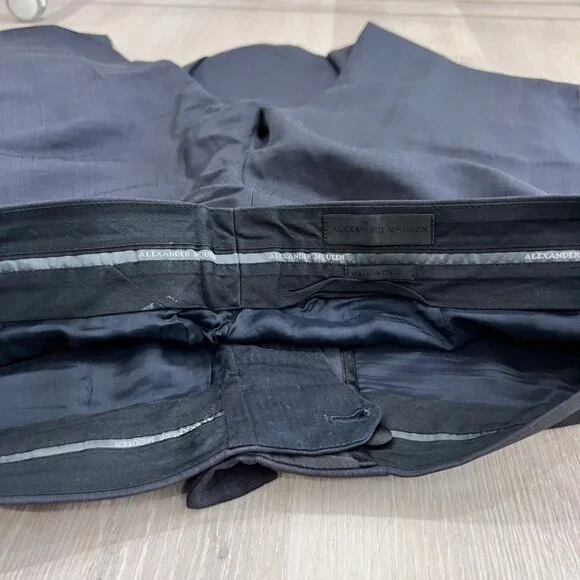 Gently Used. Condition 9.5/10.Alexander McQueen Striped Tuxedo PantsSize L / US34 / IT50 Men.Men´s navy Alexander McQueen striped tuxedo pants with black satin taping at sides, single slit pocket at backbutton and hook-and-eye closures at front.Made in Italy.FB IG BensUrbanBargain