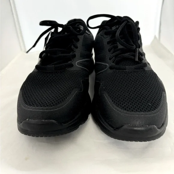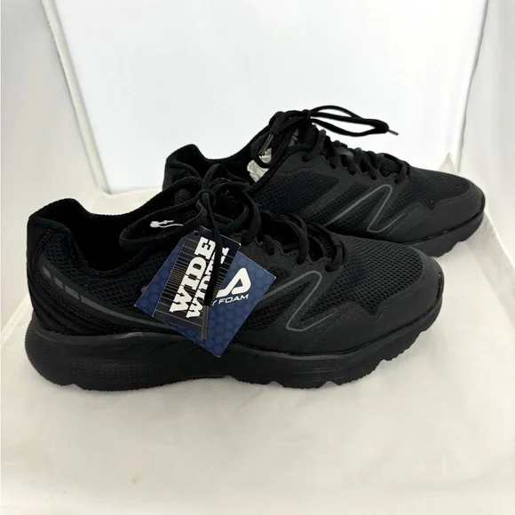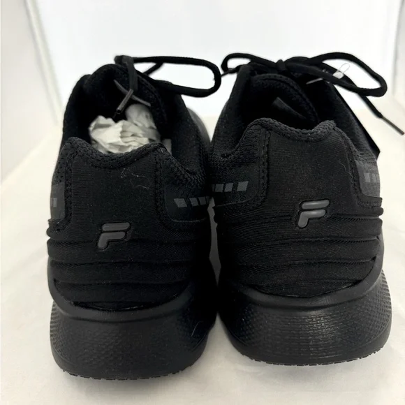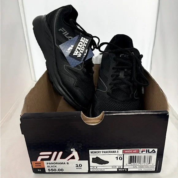 Fila Memory Panorama 8 men’sBlack shoes have a synthetic and textile upper. These athletic fashion shoes feature a lace up closure, round toe, mesh lining, and a memory lite insole with foam padding for ultimate all day comfort. It also has an EVA midsole for a cushioned walk along with a padded collar and EVA outsole for comfort and durability. Versatile enough to wear to gym, leisure, or school. New in box but missing the lid. Also still has tags attached to shoe. Sz 10 Wide (4E)