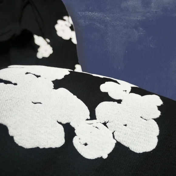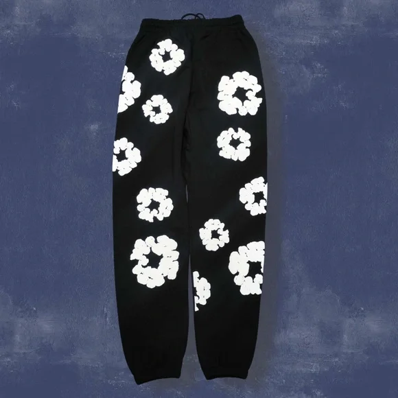 These sweatpants feature a striking black base adorned with large white floral prints, offering a bold and eye-catching look. The relaxed fit and gathered ankle cuffs ensure comfort and style, making them perfect for casual wear. Crafted from a soft, fleece-like fabric, they provide warmth and coziness for everyday activities.
