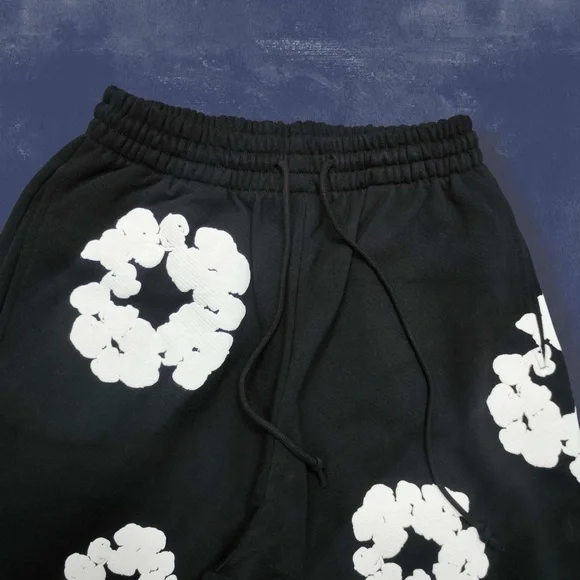 These sweatpants feature a striking black base adorned with large white floral prints, offering a bold and eye-catching look. The relaxed fit and gathered ankle cuffs ensure...