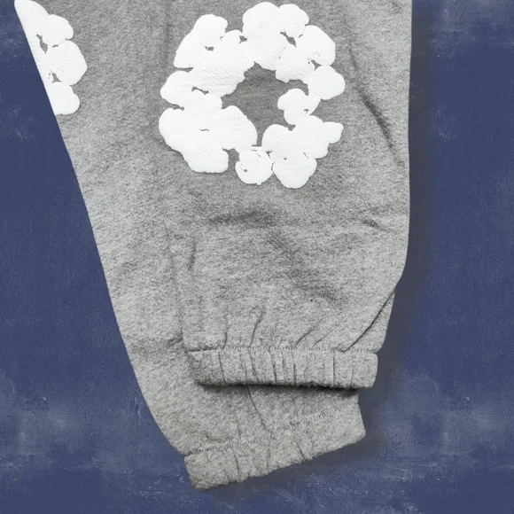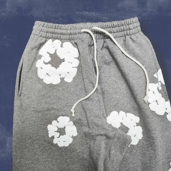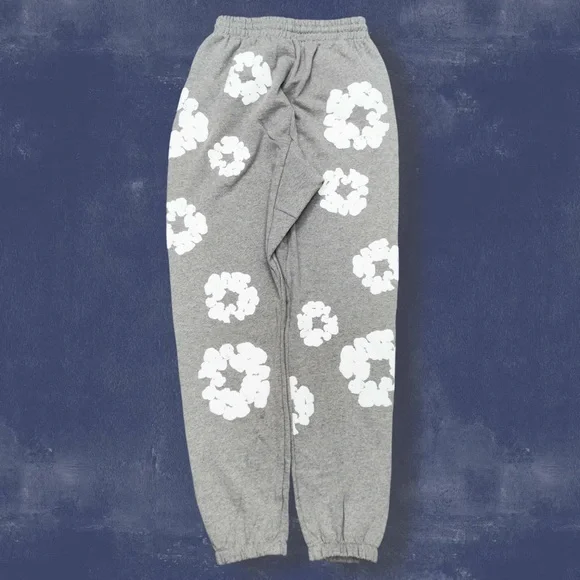 These gray joggers feature a striking white floral pattern, offering a blend of comfort and style. The relaxed fit and adjustable drawstring waist make them perfect for casual wear or lounging.