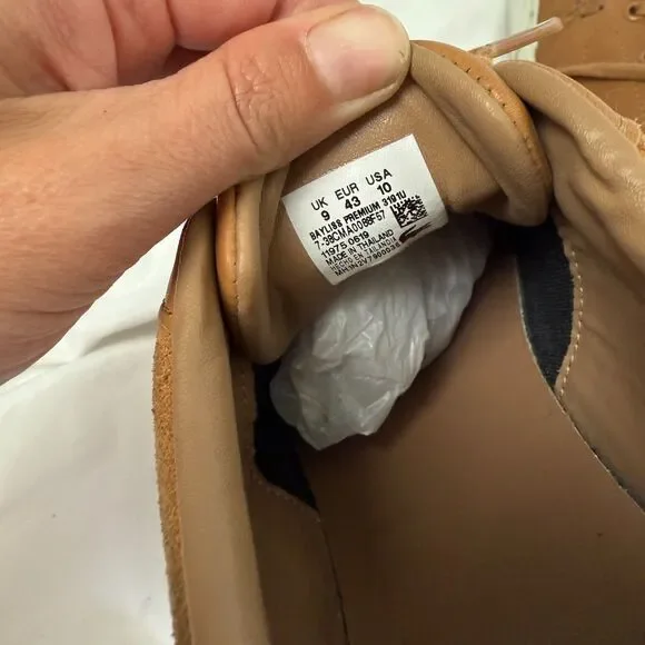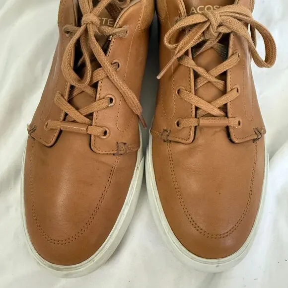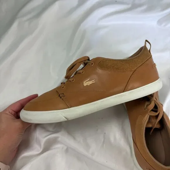 Lacoste Bayliss Tan Cognac Lace-Up Low Top Sneaker Leather Shoes Mens Size 10These are in good used condition. Do have some light dirtiness to the soles and white part along bottom of shoe. They have lots of life left, see photos.Thank you for looking, please let me know if you have any questions.