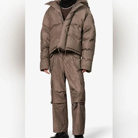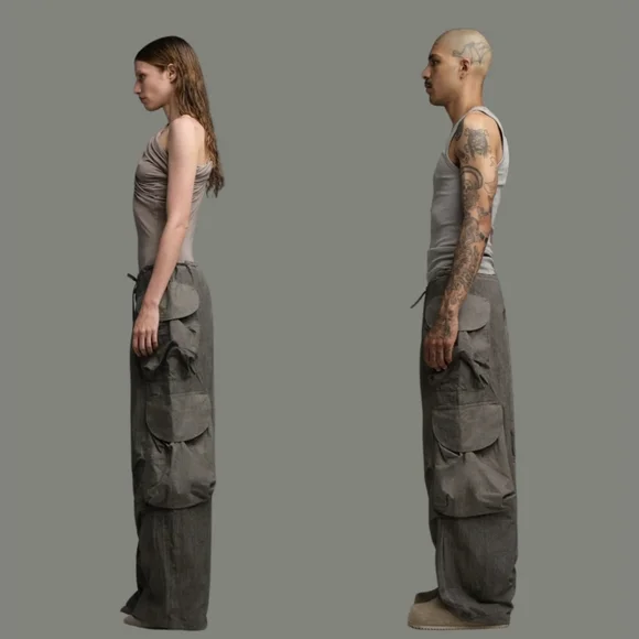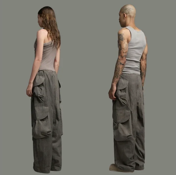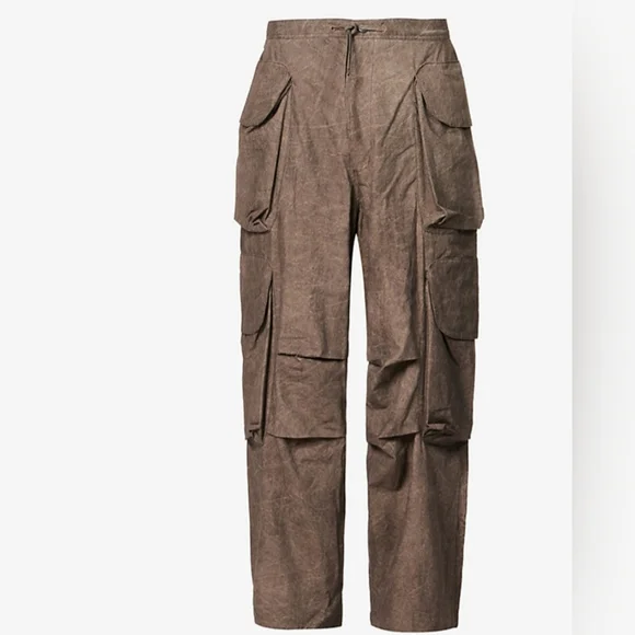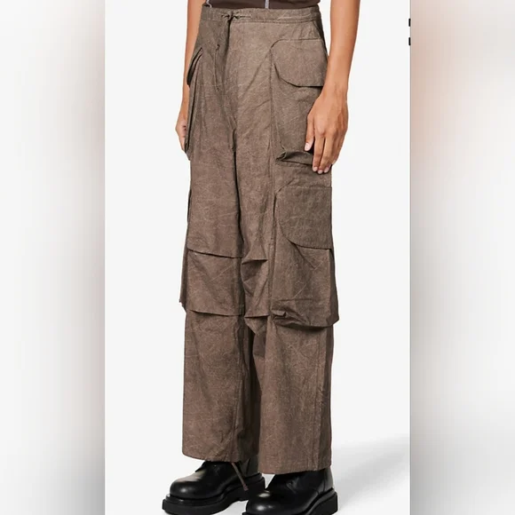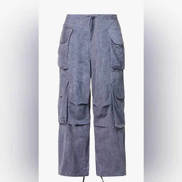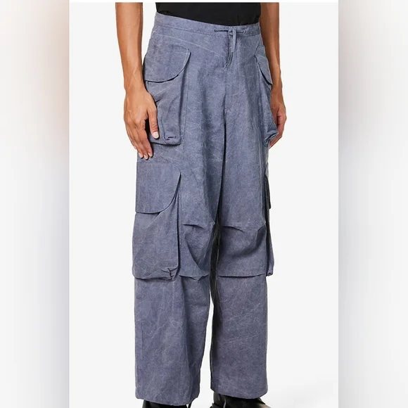 ENTIRE STUDIOS cotton-blend trousers83.6% cotton, 16.4% nylonExposed button and concealed zip-fly fastening at frontRegular fit, dropped crotch, wide leg, drawstring waist, two flap pockets at each side, all-over faded wash, drawstring hemMachine wash coldMidweight, non-stretch