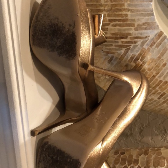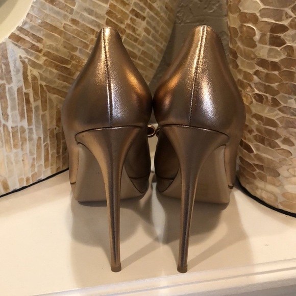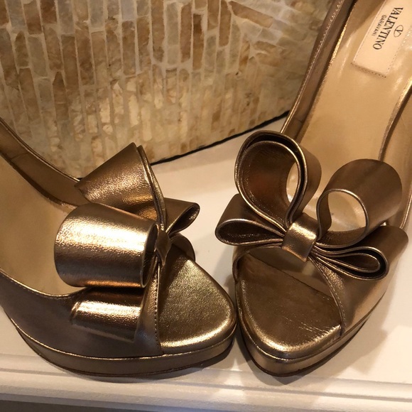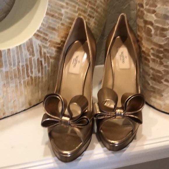Metallic Nappa Couture Bow Peep Toe Platform High Heel Pumps Light Bronze. Iconic Valentino Bow! They match so much. I’m in love with them but they are a half size too small for me.Only worn for a couple hours . No damages. Excellent condition. Stunning rose gold color !!