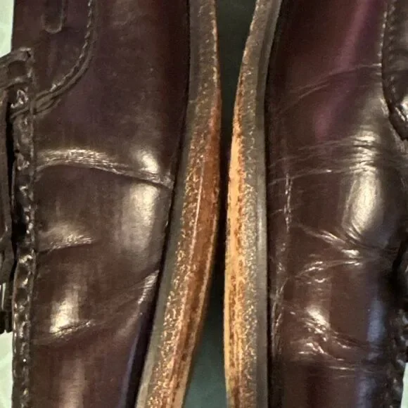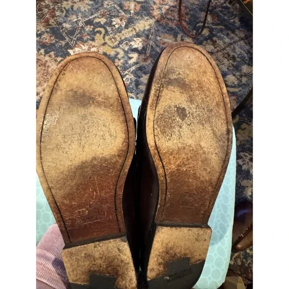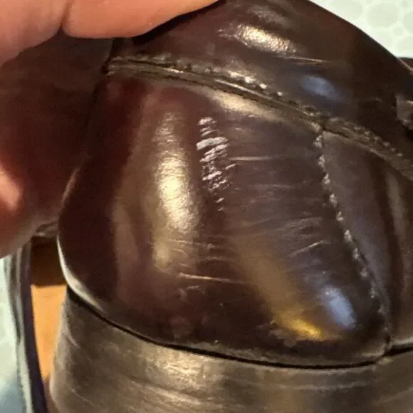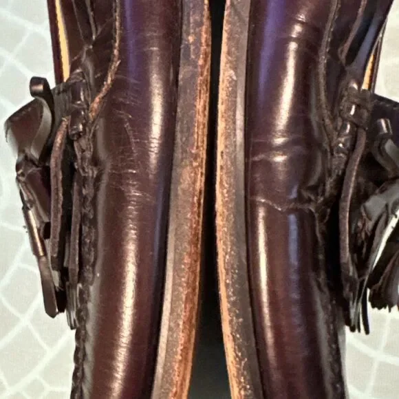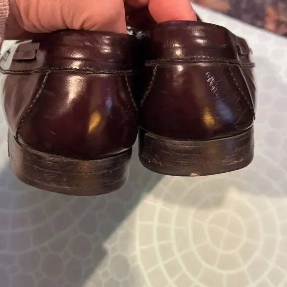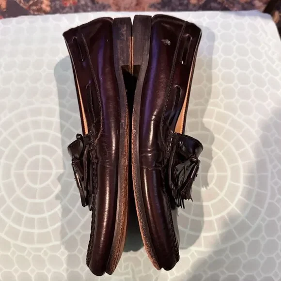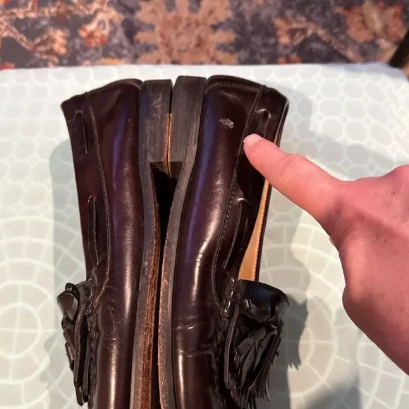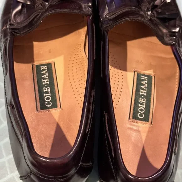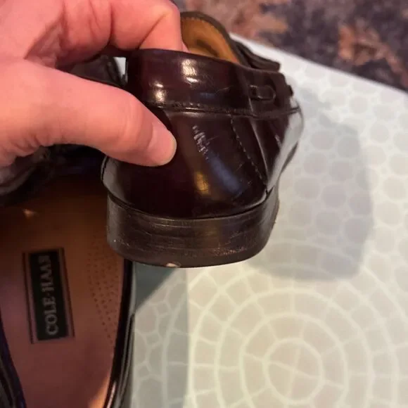 #12-2/2098-1See photos, I tried to point out a couple of white marks on the shoes. In addition any creasing or slight scuffs. These shoes still have plenty of great wear in them and on general appearance look great.Upgrade your shoe game with these stylish Cole Haan Tassel Loafers. These dress shoes feature a sleek dark brown leather upper material and a comfortable almond toe shape. The slip-on design makes them easy to wear, while the tasseled accents give them a preppy and city-inspired look.Perfect for any season, these shoes are lined with leather and have a cushioned insole for maximum comfort. They´re great for any man who wants to look sharp and feel good, whether he´s headed to the office or out on the town. Don´t miss out on these high-quality Cole Haan Pinch loaferssee the photos to appreciate their style and craftsmanship.