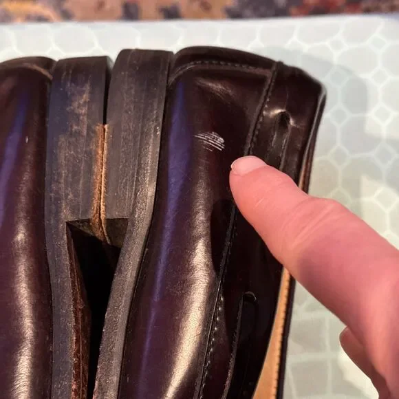 #12-2/2098-1See photos, I tried to point out a couple of white marks on the shoes. In addition any creasing or slight scuffs. These shoes still have plenty of great wear in them...