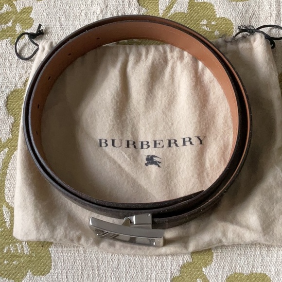 This is a Burberry belt in dark brown suede and tan leather, reversible with a solid pattern and a buckle accent. Excellent preowned conditions. It is size 42 inches (105cm) with a 1.5 inch belt width. Made of leather with nickel hardware, this vintage belt is adjustable and can be worn for both work and dress occasions. Minor scratches on the buckle due to storage (unnoticeable unless close up). It was manufactured in Italy by Burberry.Please review the photos as they are parts of descriptions and the item is being sold as is.