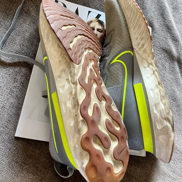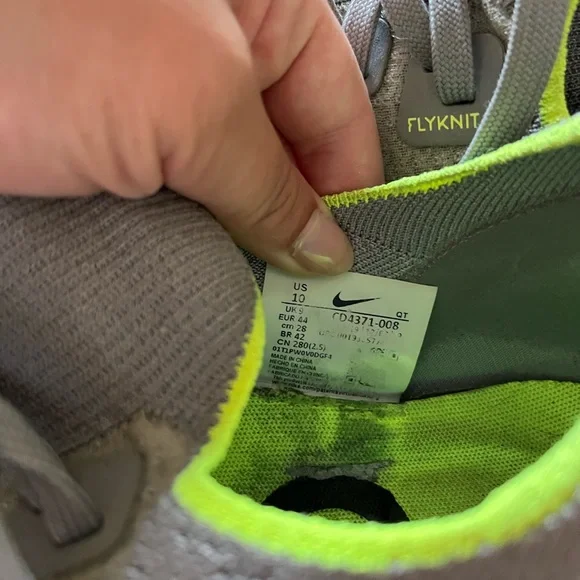 Nike REACT Gray & Lime Green FlyKnit Sneakers - Men’s Size 10Reasonably worn- some scuffs on the white rubber and tiny pull near toe tips (see photos) but otherwise great condition, especially if washed upon purchaseGymWorkoutAthlete AthleticWalkingErrands WeekendComfortableShoesSneakersGymOrig $125