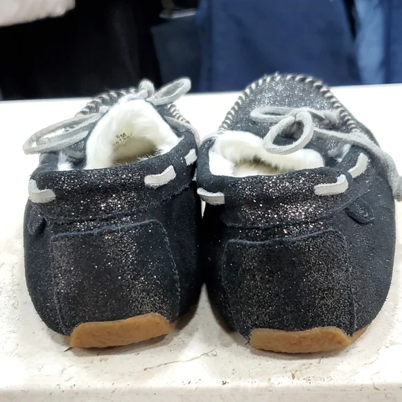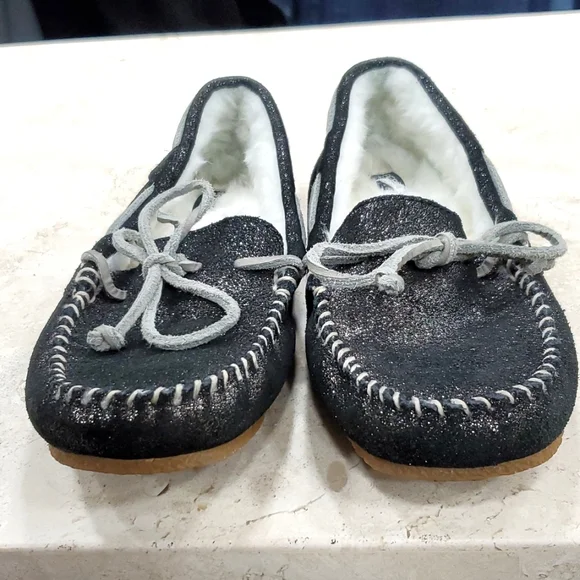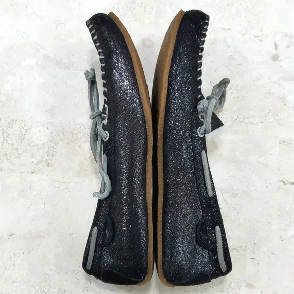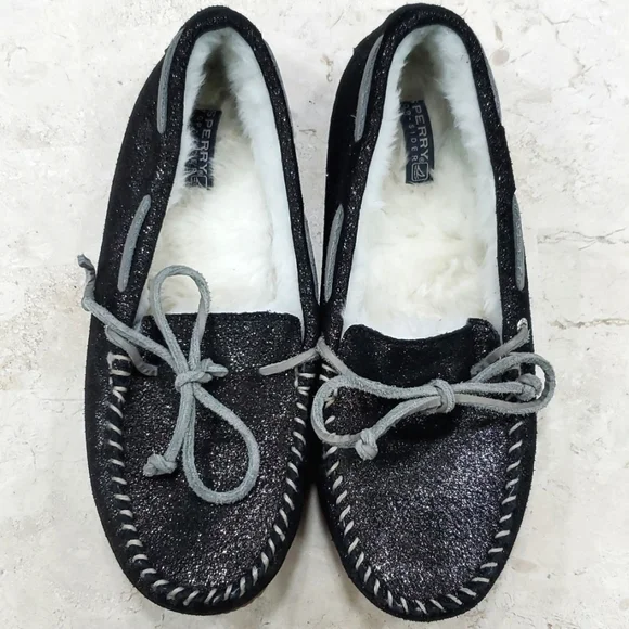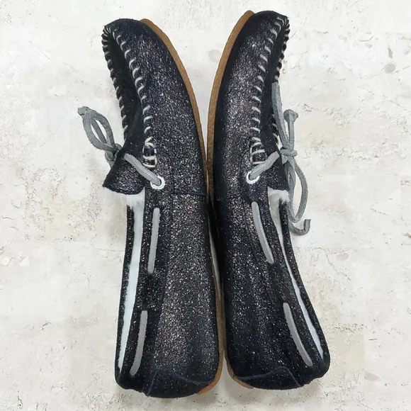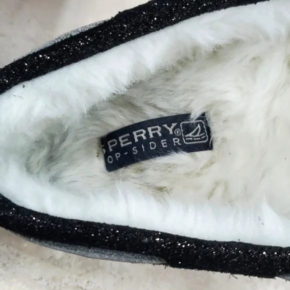 Sperry Top Siders women´s size 6 black sparkly glitter leather boat shoe moccasin wool blend faux fur liningsamplePre-owned in good condition