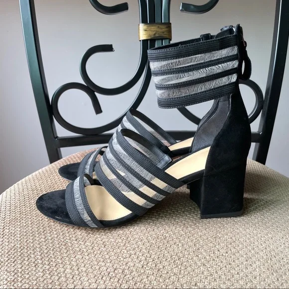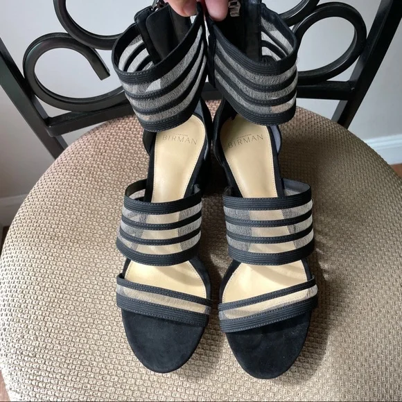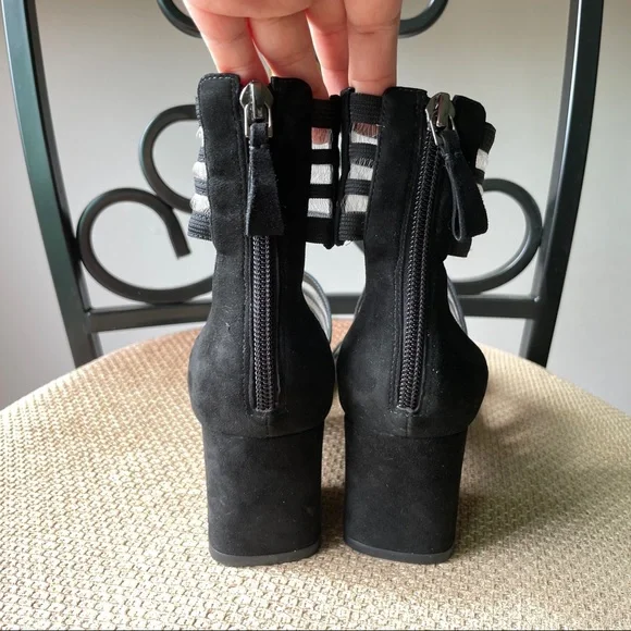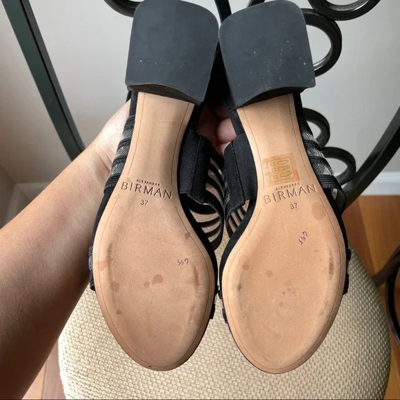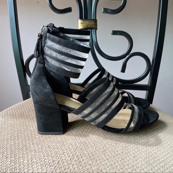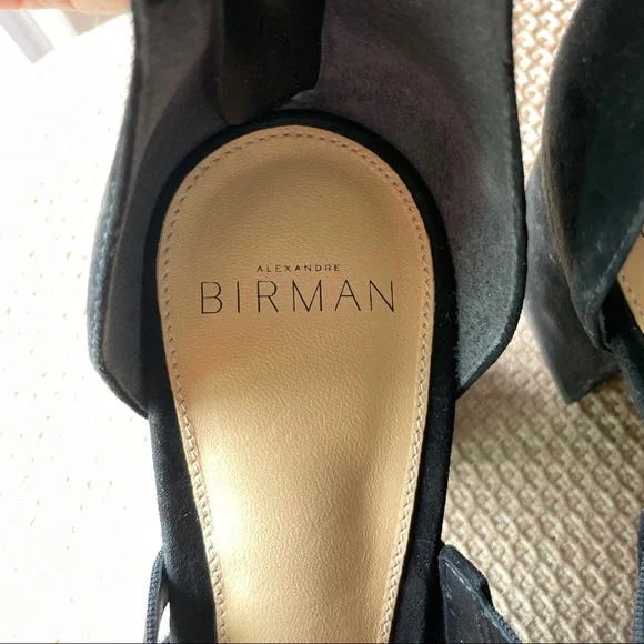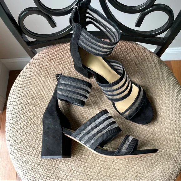 From Italy, Alexandre Birman mesh strip with black suede leather block heel sandal. Heel height: 2.5 inches Fit true to size, for wide feet, recommend size up half size.