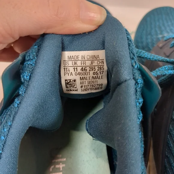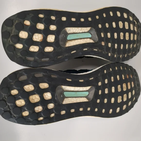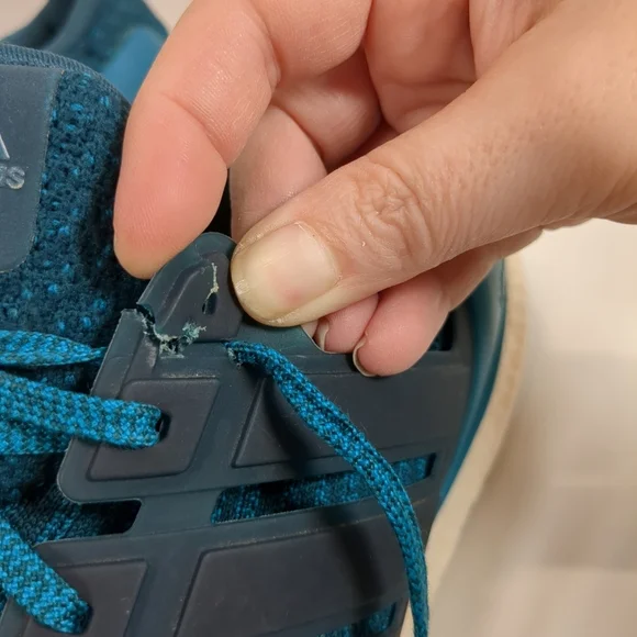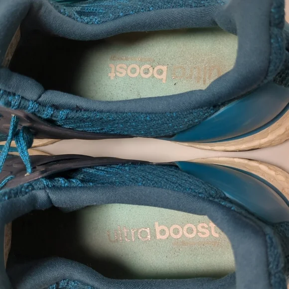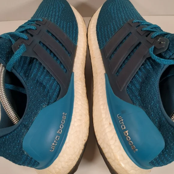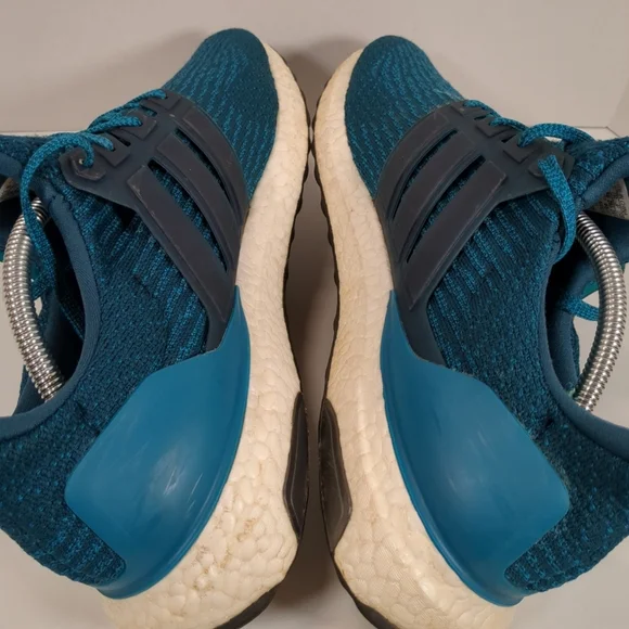 Adidas Men´s Ultra Boost Blue Running Shoes , Size 11-1/2", some staining on white part of shoe and top lace hole ripped see pics pre-owned Good Condition