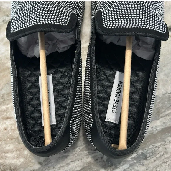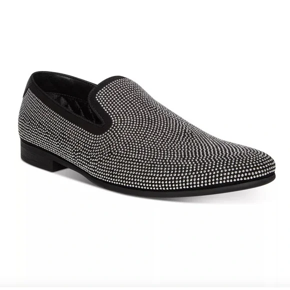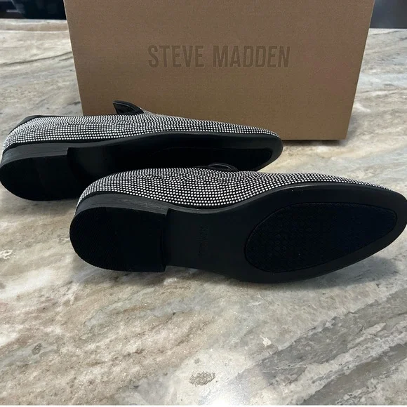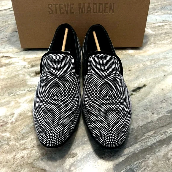 NIB $125 Steve Madden Mezmoryz Stud Smoking Slippers, Black/Silver, Men’s 10 | Formal, Slip-On LoafersBrand new in box! These standout Steve Madden Mezmoryz smoking slippers in black with silver studs blend classic loafer style with bold, modern flair. Features an almond toe, satin lining, and easy slip-on design—perfect for formalwear, weddings, parties, or nights out.Size: Men’s 10Color: Black with silver studsMSRP: $125Upper/Sole: Manmade materialsCondition: New in boxKeywords: Steve Madden men’s shoes, studded loafers, formal slippers, dress shoes, smoking slippers, party shoes, black silver loafers, men’s slip-on, prom shoes, Mezmoryz style.