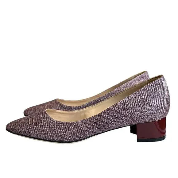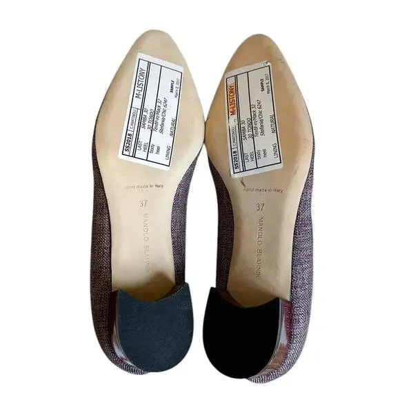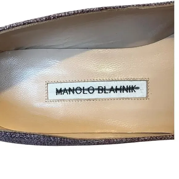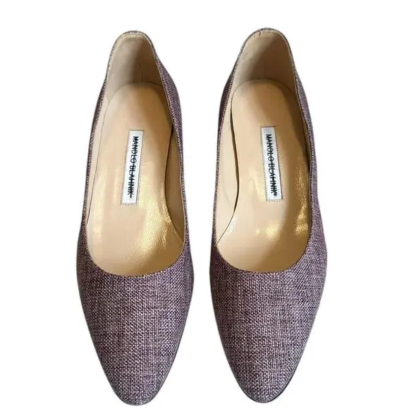 These Manolo Blahnik heels feature a sophisticated purple hue and a classic pointed toe silhouette, perfect for adding a touch of elegance to any outfit. The design is streamlined and versatile, making them ideal for both professional and casual settings. With their timeless appeal, these heels effortlessly combine style and comfort.