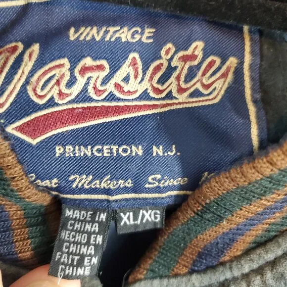 Vintage Varsity Leather Seude Two Tone Full Zip Mens Sz XL JacketRibbed Bottom Hem, Neck Hem & Slv Cuff, Front Pockets, Full Zip, Dry Clean OnlyMaterial: Leather, Nylon Polyester & AcrylicMeasurements: Bust 28.5in, Slv 27in, Length 29inIn good used condition....PLEASE NOTE: Color under arms and side of jacket by arms is discolored as pictured.Needs Dry Cleaned. Weight: 2lb 10ozSKU: 01294C42All items are measured laying flat with a tailors tape and Most all items are NOT stretched when measuring unless specified.*Please be sure and check all sizes and measurements before purchasing.Its always a good idea to measure an item you already own, that resembles the item you are wanting to buy, so to be sure its comparable size. *Be sure and Washor Dry Clean ALL clothing items before wearing!*Some cloth/shoe/stuffed animal items may come with desiccate packets or fabric softener squares for freshness while in inventory.Some items may be washed as well whether new or used. We will be happy to answer any questions you may have!