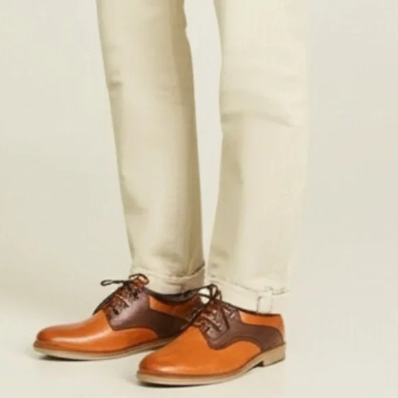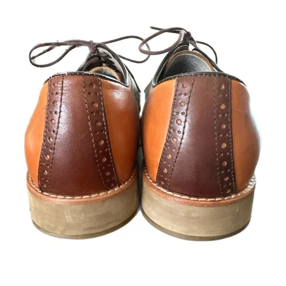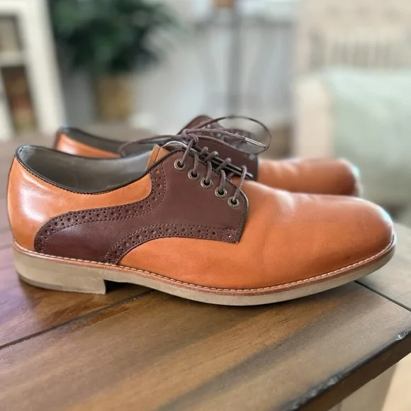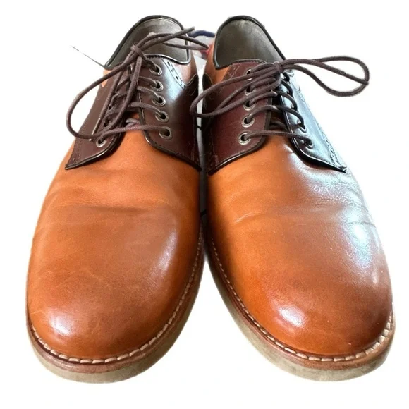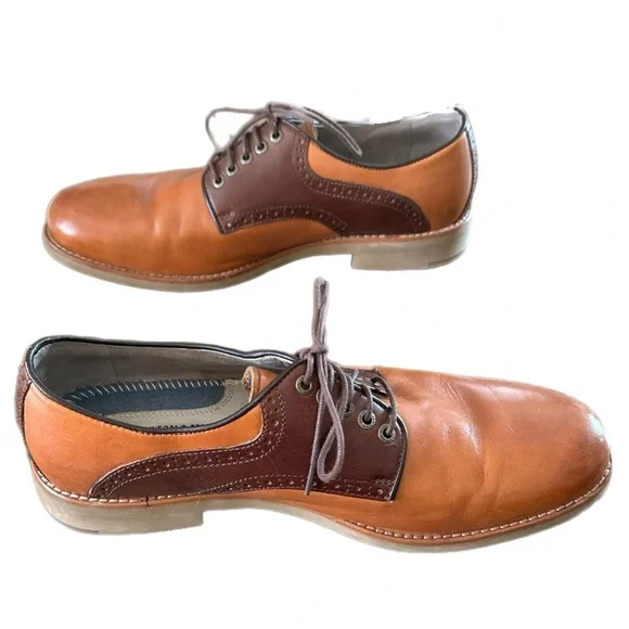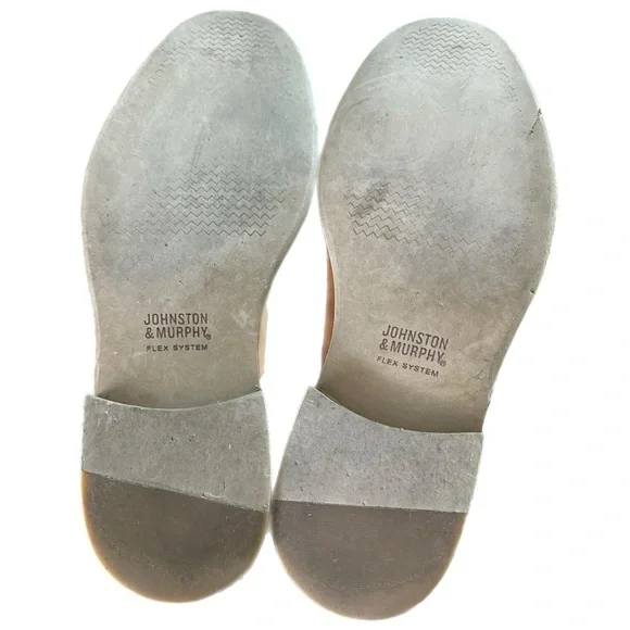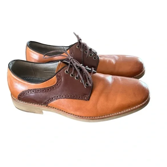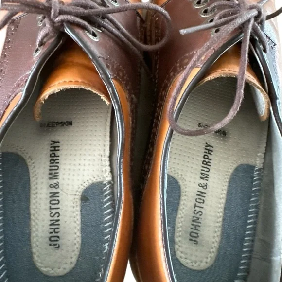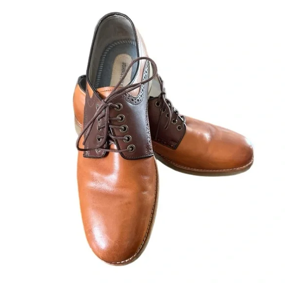 Crafted for the discerning gentleman, these Johnston & Murphy Ellington Oxford shoes feature a refined two-tone brown leather design, complemented by luxurious sheepskin lining. The shoes blend classic style with modern comfort, boasting a Flex System outsole that allows for effortless movement.Leather exteriorSheepskin liningAlmond toeLace up closureUS Size men’s 9.5 regularVery Good previously owned condition- slight signs of wear on exterior leather, some wear on bottoms.MSRP $159